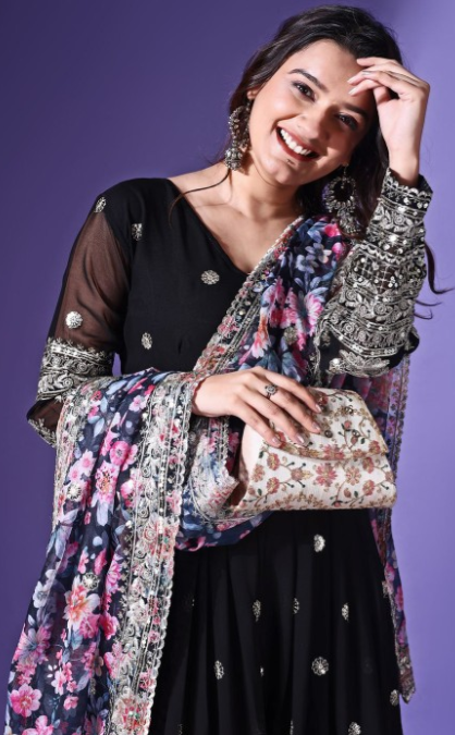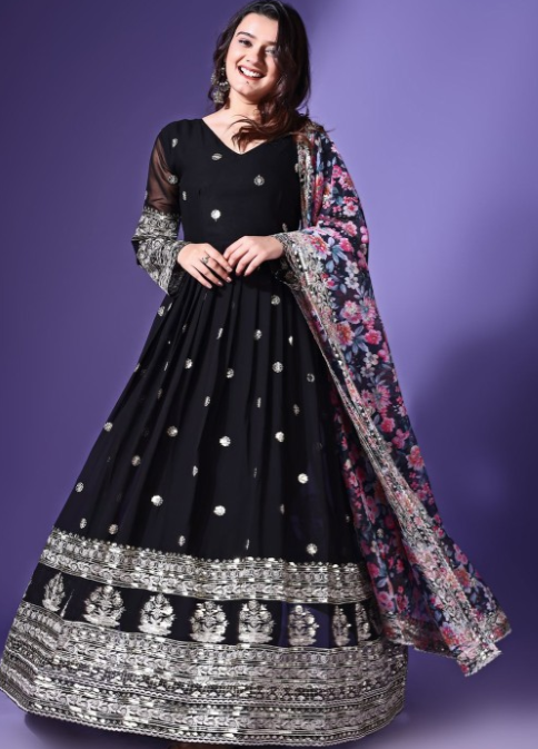 This Embroidered Georgette Anarkali Gown is a stunning ethnic dress, featuring delicate embroidery that adds a sophisticated touch. Made from high-quality georgette fabric, it offers both comfort and flow. The Anarkali silhouette provides a graceful fit, and the matching dupatta enhances its traditional charm. Perfect for weddings, celebrations, or special occasions.