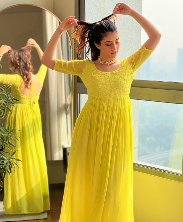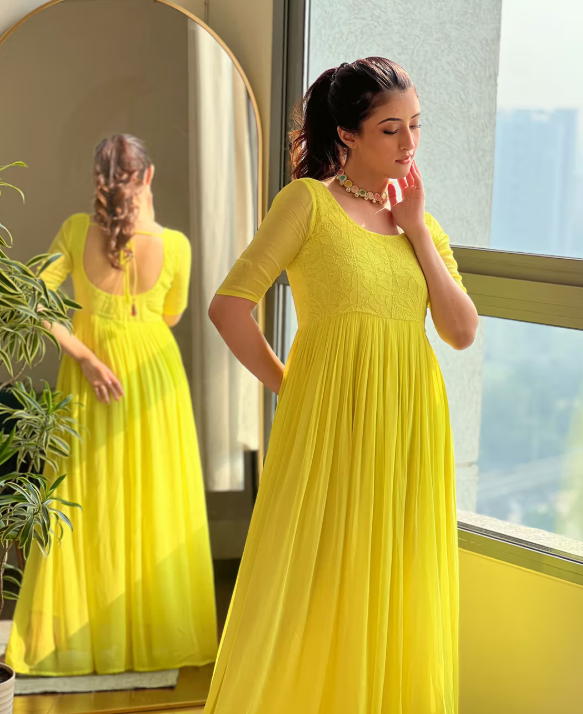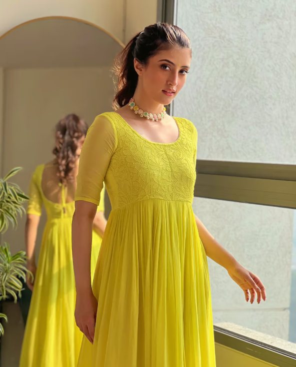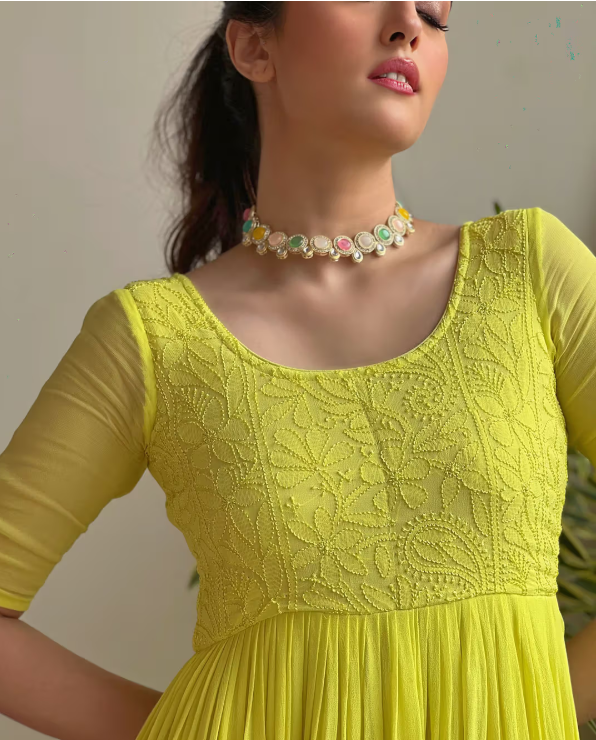 The Lime Yellow Chikankari Gown is a vibrant and elegant piece featuring traditional Indian embroidery. The bright lime yellow color adds a cheerful and fresh look, while the intricate Chikankari work enhances the gown’s beauty with delicate, hand-embroidered patterns. This gown is perfect for festive occasions, weddings, or cultural events, offering a blend of modern style with traditional craftsmanship. The overall design creates a flattering and graceful silhouette.