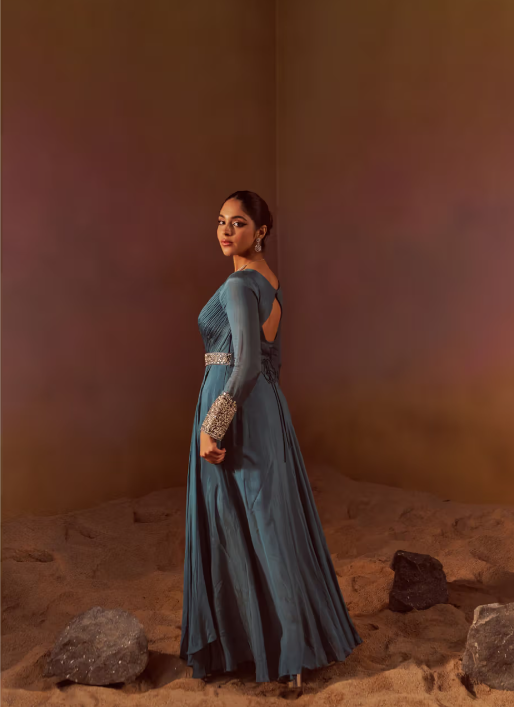 A blue full sleeves Indowestern gown with a belt is a stylish fusion of traditional Indian and Western fashion. The gown features long sleeves and a contemporary, elegant silhouette, blending the charm of a classic gown with Indian design elements. The addition of a belt accentuates the waist, offering a structured look while adding a touch of modern flair. The rich blue color makes it perfect for festive or formal occasions, while the Indowestern style ensures a unique and fashionable appearance.