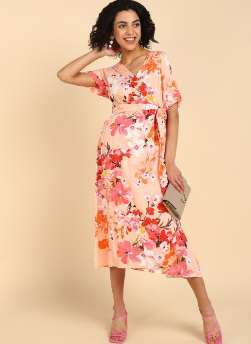 A Floral Print Maternity Wrap Gown is a stylish and comfortable dress designed for expectant mothers. The gown features a beautiful floral print, adding a vibrant and feminine touch. The wrap design provides a flattering fit, adjusting to the changing body while offering comfort and ease. Perfect for baby showers, maternity photoshoots, or casual events, this gown blends fashion with functionality.