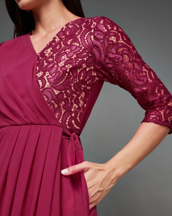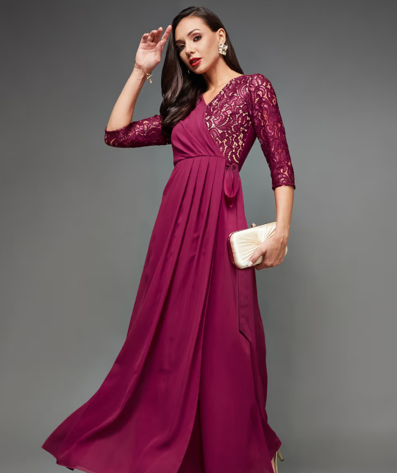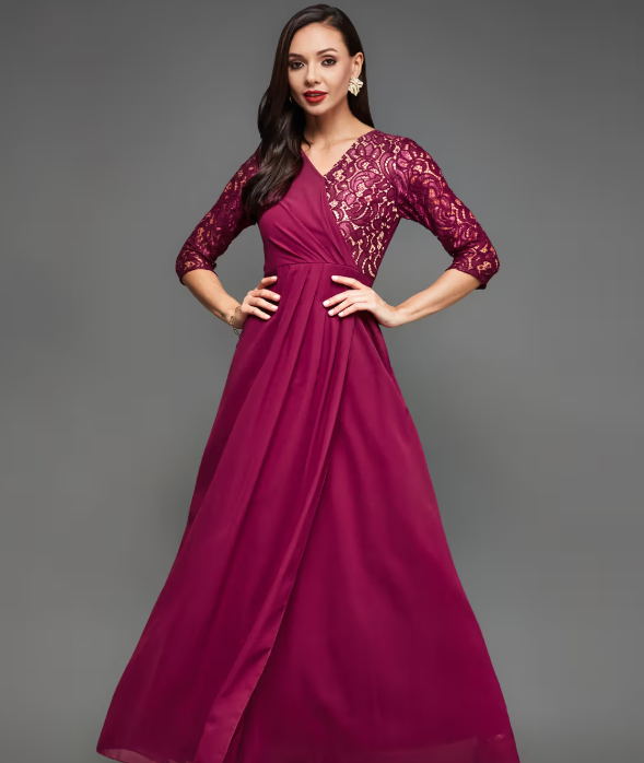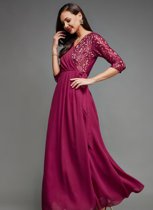A Women’s Dark Pink V-Neck 3/4 Sleeves Wrap Gown Party Dress is a stylish and flattering outfit designed for evening events. The deep pink color gives it a bold and sophisticated look. The V-neck adds a touch of elegance, while the 3/4 sleeves offer balance and comfort. The wrap-style design enhances the silhouette, creating a flattering, figure-hugging fit. Perfect for parties or formal gatherings, this gown combines chic style with effortless grace.