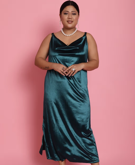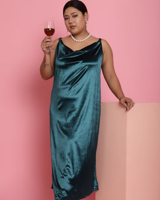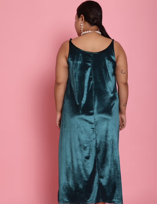 The Plus Size Women’s Teal Solid Color Velvet Party Wear Maxi Dress offers a luxurious and stylish look. Made from soft velvet fabric, it provides both comfort and elegance. The rich teal color adds a bold yet sophisticated touch, while the maxi length creates a graceful, floor-sweeping silhouette. Perfect for parties, formal events, or evening gatherings.