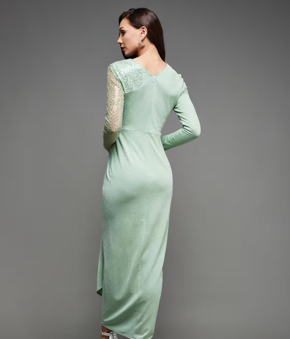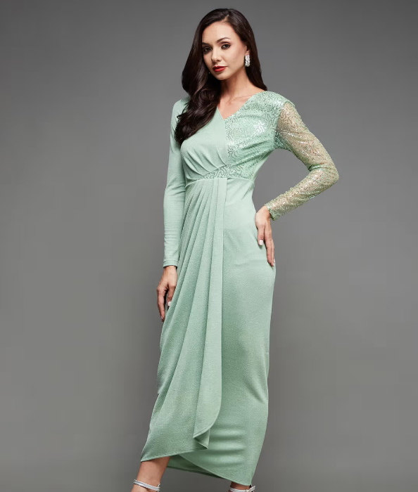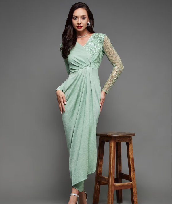 The Mint Sequined Evening Gown is a stunning and sophisticated piece, featuring shimmering sequins that add a touch of sparkle and glamour. The gown’s mint color offers a fresh and elegant look, while the sleek design ensures a flattering fit. Perfect for evening events, galas, or special occasions, this gown is sure to make a statement.